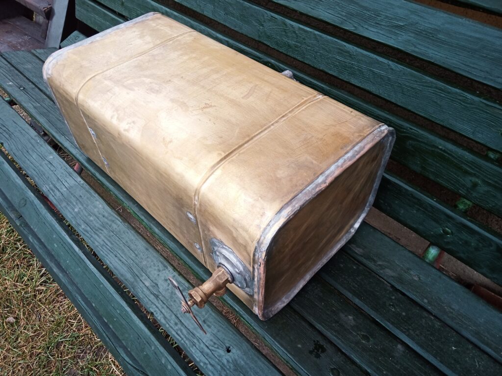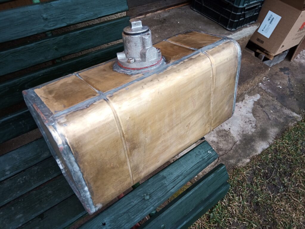 Navázal jsem na skvělou spolupráci se společností Kvinto (viz kapitola o renovaci chladiče pro lokomotivu Gmeinder) a nechal vyrobit přesnou repliku původní mosazné naftové nádrže. Dle očekávání jsem obdržel opět špičkový výrobek s vysokou kvalitou technického zpracování. Vzhledem k „ušlechtilosti“ použitého materiálu a čistotě práce nebude nádrž opatřena žádným nátěrem a bude na stroji prezentována takto. Věřím, že přispěje ke kvalitě rekonstrukce zmíněného stroje.